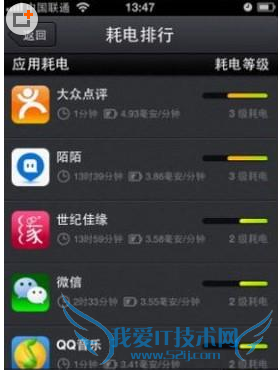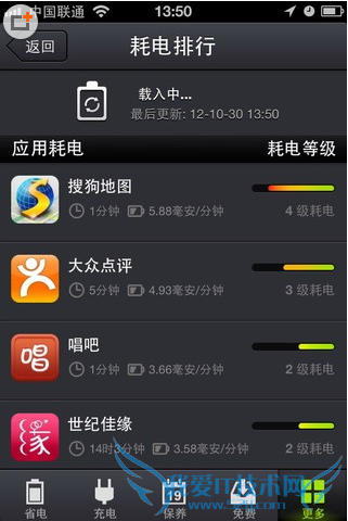 2、我们都知道手机耗电主要在两个部分,一个是手机上安装的应用程序耗电,另一个就是手机系统自身耗电。所以,排行榜中分别针对两大块进行了排行:应用耗电排行和系统耗电排行。应用耗电是针对正在运行的应用程序的耗电情况,系统耗电是针对系统进程的耗电情况。由截图可看出,该排行榜的界面很整洁,反应的信息也很明晰