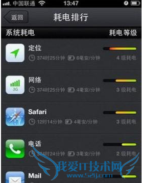 3、接着,从截图中可以看出,排行榜中显示的信息有应用或进程运行时间、每分钟消耗电量毫安数,然后是根据这个每分钟消耗的电量毫安数所做的一个耗电等级标注。