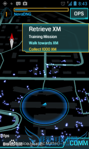 游戏的最低目标是获取虚拟物质 XM,下图中那些月白色的小光点就是 XM。于是我便顶着 13 度的低温下楼开始进行第一个教学任务。第一个任务很简单,搜集 1000 单位的 XM 即可。搜集 XM 不需要任何操作,只需要移动到月白色光点附近,让光点进入你周围的蓝色光环内,XM 便会自动被收集。