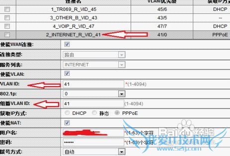 的一项,记录下参数或干脆截屏(特别是LAN ID参数与组播VLAN ID参数 )>>> 然后删除带有INTERNET的项,再新建一个项 >>> 参数设置如下 连接类型选择路由;服务列表选INTERNET ;把刚记下的VLAN ID和组播VLAN ID填上(每个地区的都不一样,必须填上你刚记下的);获取IP方式改为PPPoE;使能NAT打钩;填写上网的用户名与密码;拨号方式自动 如下图为更改后的设置。