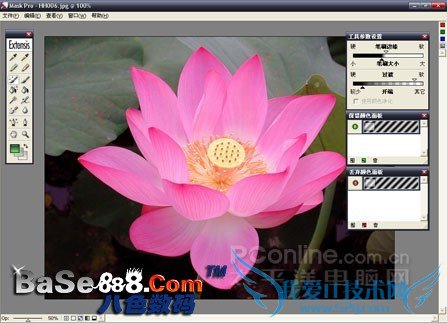 Mask Pro 4.0汉化破解版的界面可以分为菜单栏、工具栏、工具参数设置、保留颜色面板、丢弃颜色面板和工作区几部分。菜单栏中所包括的命令为一些常见的命令,比如保存、还原、查看和编辑等,这里不详细介绍菜单栏的使用方法,只对本文中用到的其他一些工具和面板进行介绍,另外的一些工具在后文中需要用到的地方再进行说明。