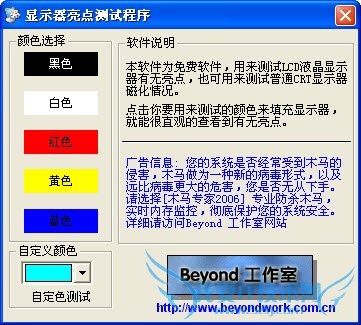 免安装的LCD显示器坏点测试工具,通过显示纯色来协助肉眼查找显示器的坏点,避免购买时被奸商刮一刀:)1.点击任一按钮以全屏显示纯色2.然后使用方向键反复切换颜色3.按下Esc键则可退出全屏此程序是免费软件,可在保留版权信息的前提下任意分发和使用