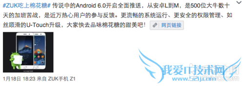 从截图中可以看到,ZUK官方微博于1月18日发文称“#ZUK吃上棉花糖# 传说中的Android 6.0开启全面推送,从安卓L到M,是500位大牛数十天的加班苦战,是近万热心用户的参与反馈。更流畅的系统运行、更安全的权限管理、如丝顺滑的U-Touch升级,大家快去品味棉花糖的甜美吧!”并附上升级的具体操作方法,方便用户快速、安全的进行升级。