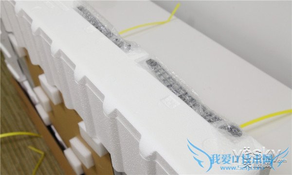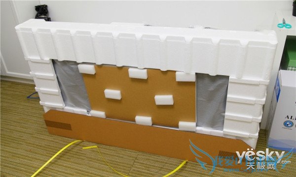 向上垂直取出外包装后,可以看到内部的防震处理也做得相当到位,除了四角厚实防震棉之外,面板和背部都有做防震处理。值得一说的是,酷开对于其产品在运输安全方面的措施一直做得比较到位,这一点是值得称赞的。