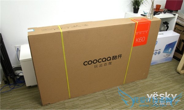 在包装上酷开K60与酷开旗下其他产品差异不大,环保牛皮纸包装简约时尚,没有过多的装饰。但单从包装上看,60寸着实比以往的50+寸电视产品要大上不少,需要两个人协力才能搬动,这点是非常明显的。