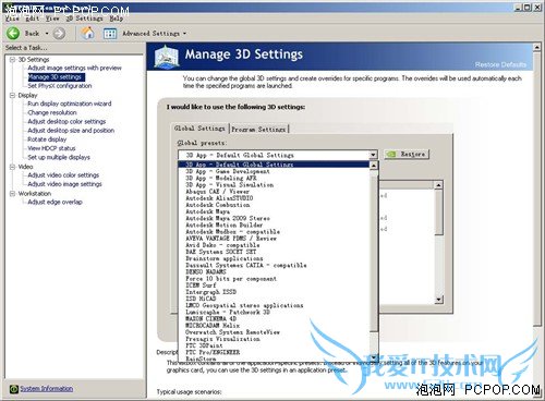 打开QUADRO FX1800的控制面板,我们会发现,在软件优化栏目中,已经加入了极为丰富的专业图形软件选项,只要选中您在使用的软件,QUADRO专业驱动会自动为您设定好具针对性的最优化设置,达到稳定性、画质、性能的高度统一!