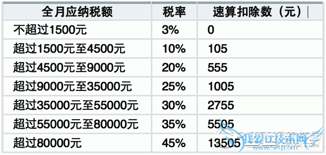 2、上表是2011年个税改革后,起征点由2000元调整至3500元后的七级超额累进个人所得税税率表,2011年9月1日起开始使用。