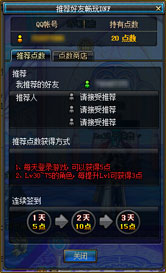 | 组队刷图 | 新玩家与自己推荐的QQ号下的角色一起组队,每消耗1点疲劳值获得推荐点数:1点 |