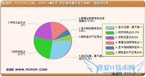 不久前,我们在显卡频道做了一个调查,见下图。可以看出在这6中常见的显卡故障中,显示花屏,看不清字迹、突然死机、开机无显示以及屏幕出现异常杂点或图案这四项占据的比重最大。
