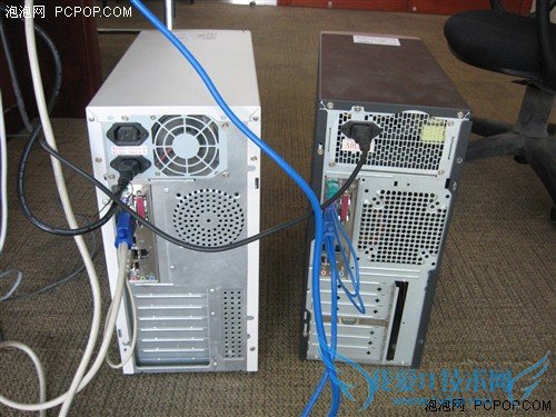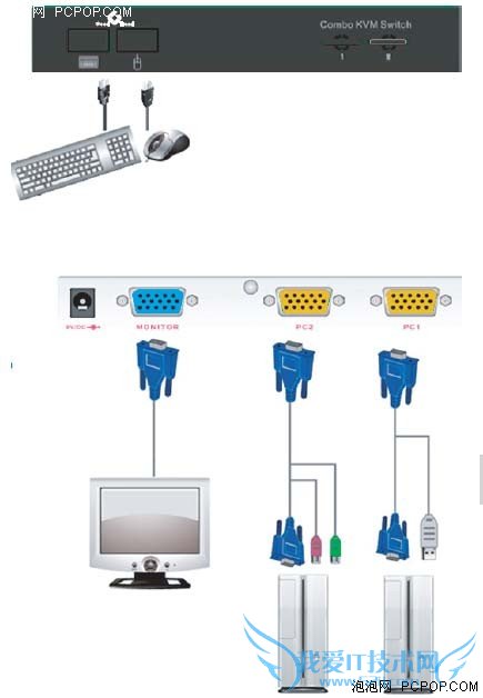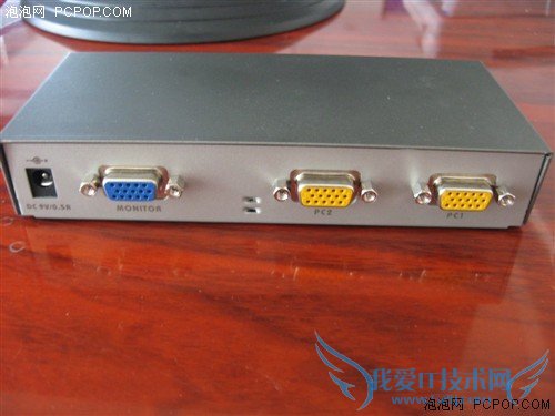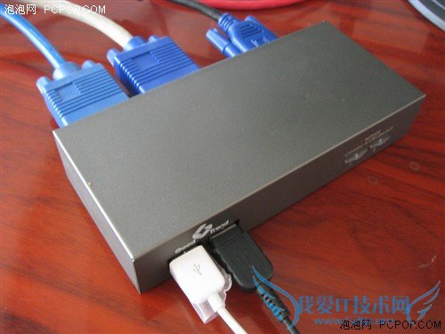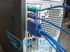 切换器背板上为电源接口以及三个VGA接口,蓝色的连接显示器,两个黄色的连接主机,在连线上产品配备了两种接口,一种是USB接口,另一种为PS/2接口,实现功能上两种连线是相同的,只是PS/2接口的连线可以节省主机的一个USB接口而已。其他诸如显示器及键鼠等配角就不再多说,下面我们就把设备连接起来进行测试。
