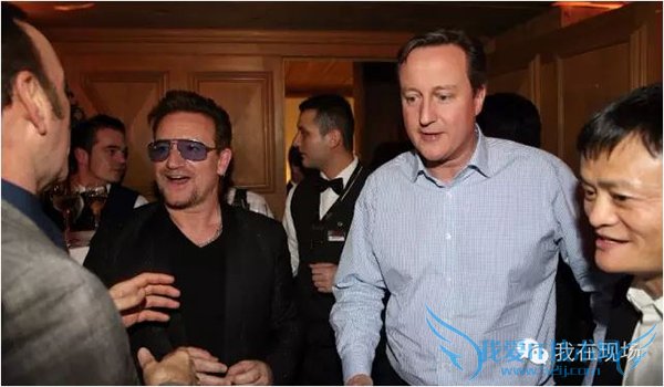 从左至右:《纸牌屋》主演史派西、U2主唱波诺、英国首相卡梅伦、马云