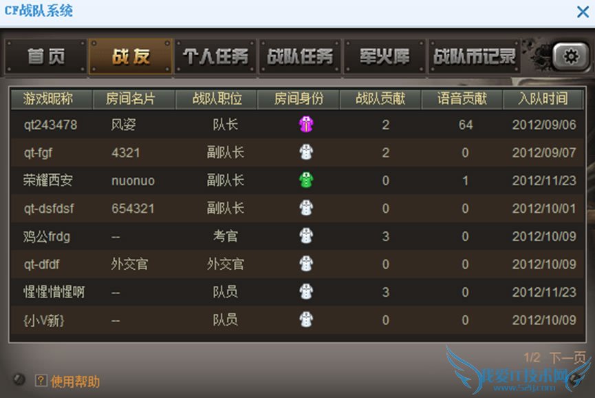 2、切换到战友页面,可以查看战队队员的职位,贡献值等信息(如上图)。