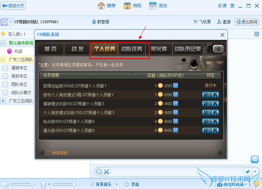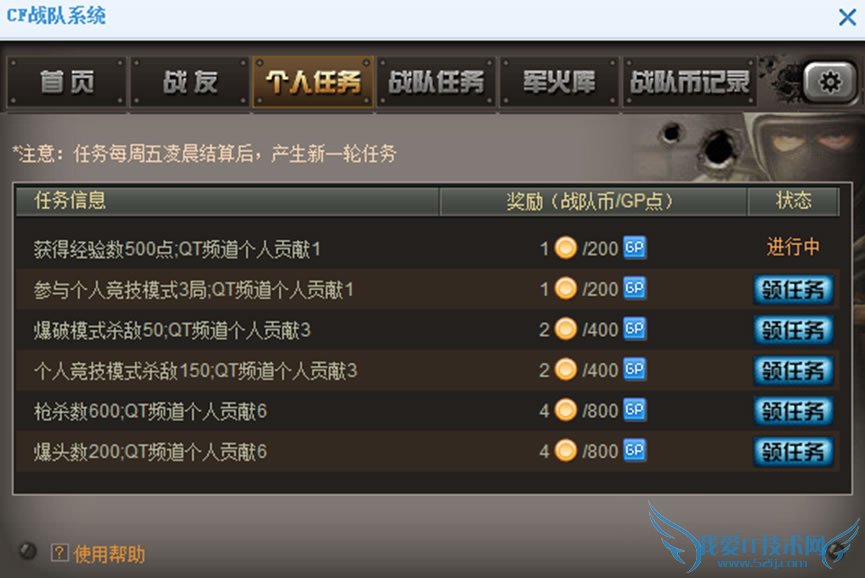 进入“个人任务”界面领取任务,然后在CF游戏内去达成任务条件。完成后系统自动发放对应奖励。GP点直接发放至游戏内,战队币获取情况可进入“战队币记录”界面查看(如上图)。
