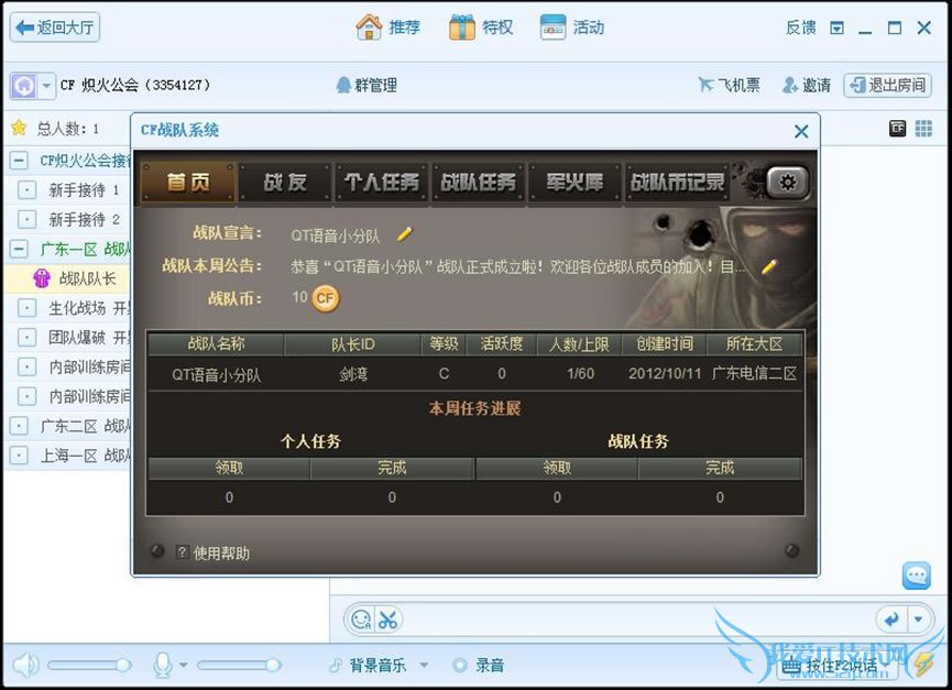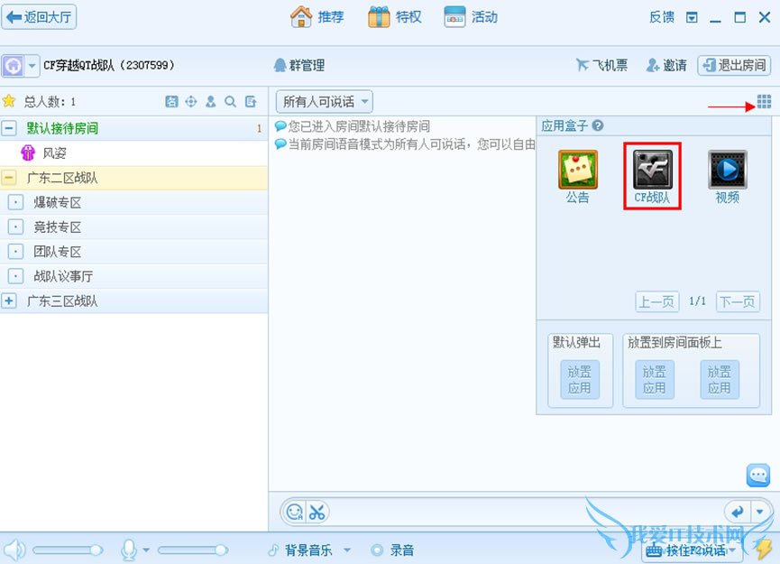 第一步:登录QT,进入您战队的房间。房间右上角有应用盒子,打开里面的“CF战队应用”(如上图)。