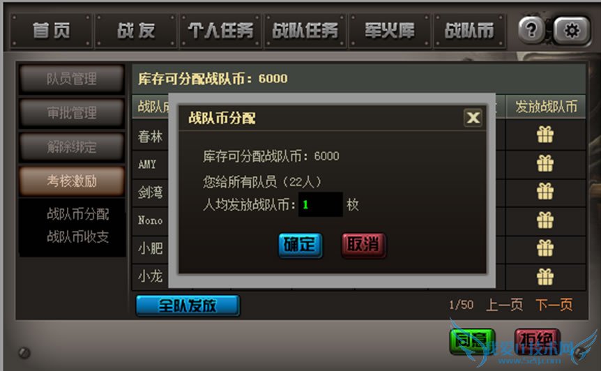 另外,战队还有一个小金库(成员完成战队任务,会给战队金库一笔额外战队币收入),队长可以分发战队币给各个成员(如上图)。