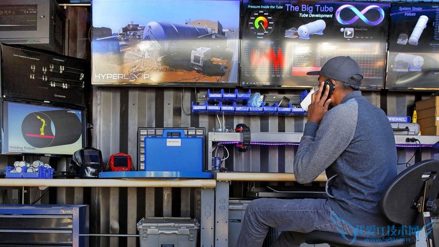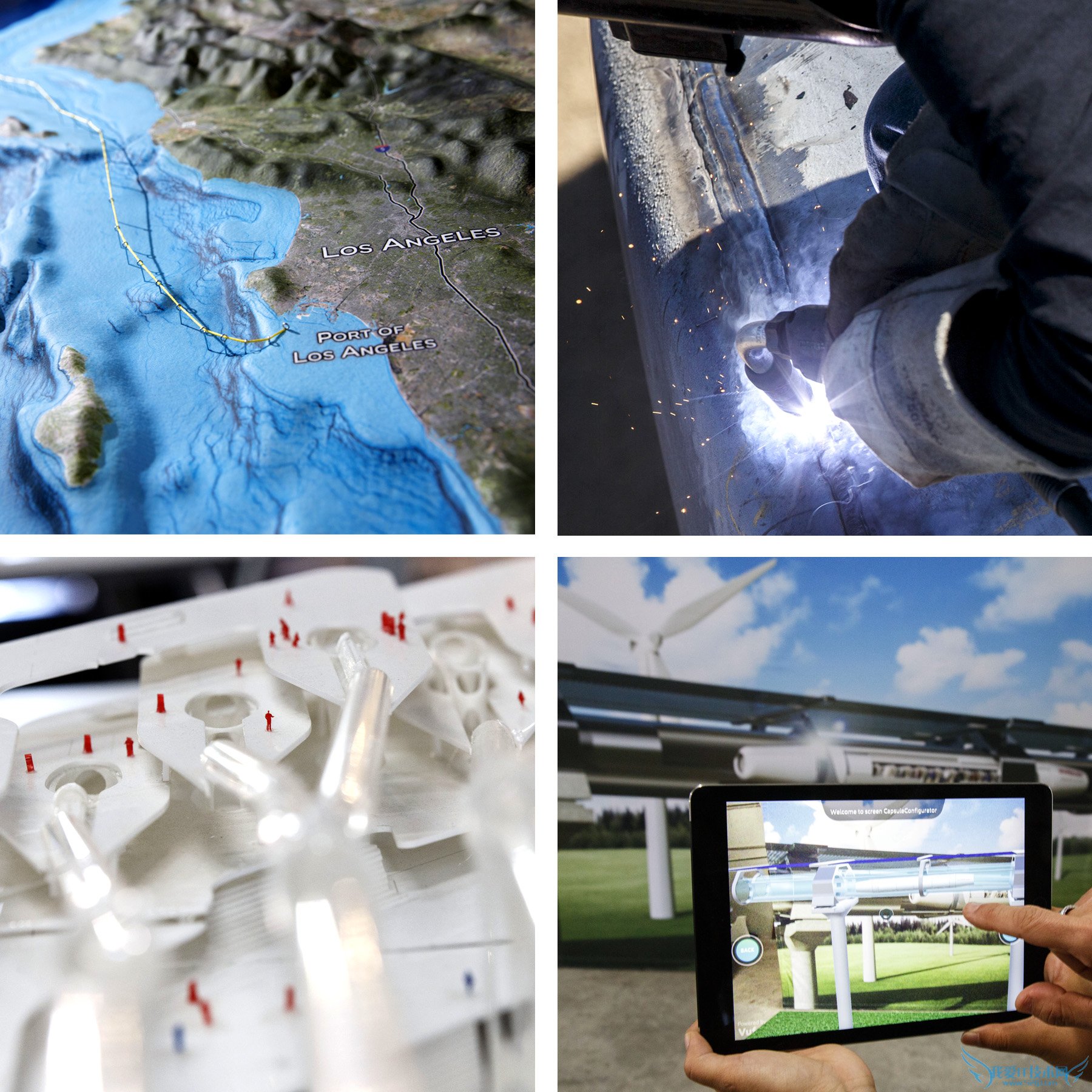 规划线路(左上)HT公司在焊接管道(右上)HTT公司的超级高铁车站模型(左下)iPad展示胶囊原型(右下)