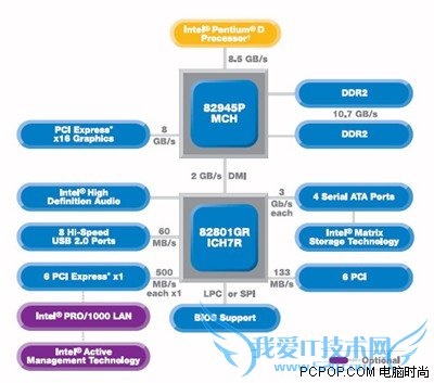 945P Express的两款芯片都是全新产品,它由82945P MCH和ICH7构成,MCH和ICH之间用最大2GB/s数据传速率的DMI(Direct Media Interface)连接。这种Intel最新的芯片组定位于高性能桌面平台,标准的搭配是双核心Pentium D系列处理器。