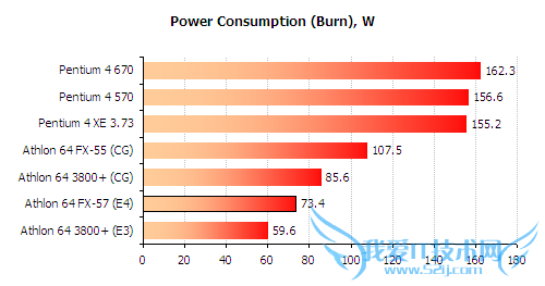 另外还有令人欣喜的一点是,经过国外同行的测试,FX-57得益于采用全新的90nm San Diego核心,2.8GHz的频率并没有使FX-57的功耗有所提高,虽然和FX-55的额定功耗标准都是104W,但在实际使用中,FX-57的功耗甚至比FX-55还是低不少,相当令人满意。这样的结果使FX-57也具备一定的超频能力,风冷达到3GHz易如反掌。
