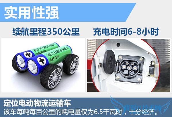 动力部分,新车配备三元锂电池,容量为34.5千瓦时,可采用慢充和快充两种方式,充电时间分别为6-8小时和1.2小时。作为物流用车,该车最高时速达到120公里/小时,综合工况下最大续航里程为350公里,0-100公里/小时的加速时间低于14秒。此外该车每吨每百公里的耗电量为6.5千瓦时,作为运输用车可谓是十分经济。