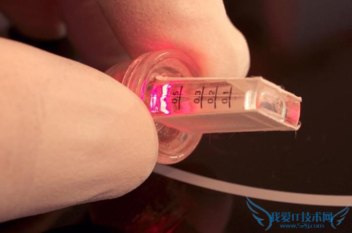 接着一束光将经过这个植入物:一个释放近红外光的集成LED灯将开启并照亮一个包含转基因细胞的培养腔。当近红外光照亮细胞时,它们开始产生所需要的蛋白质。