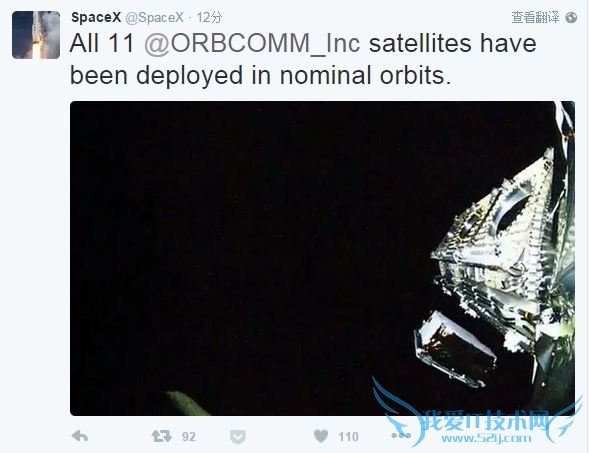 SpaceX全部11颗@ORBCOMM_Inc 的卫星已被送入预定轨道