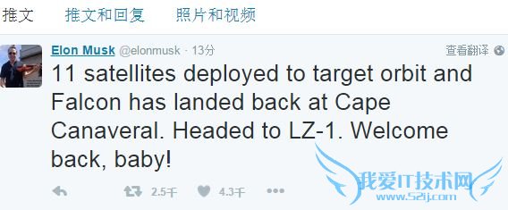 马斯克发表推文庆祝火箭回收成功“欢迎回来,宝贝!”