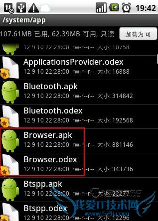4.进入到app文件夹里后,可以看见很多小绿色机器人图标的文件,此时界面右上角有一个“只读”的文字,我们点一下它旁边的白色按钮“加载为可..”,旁边的“只读”变成了“可写”。好了,再让我们看看列表里的程序们,他们就是我们系统里的相关程序文件了,比如我们需要删除系统自带的浏览器,怎么办?用你神奇的手指滑动屏幕找到它吧,它在这里的名字叫做“Browser.apk”和“Browser.odex”。如下图: