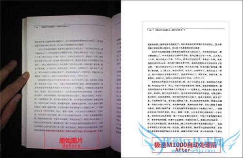 如图所示,原始的扫描图片为一张曲面的图片,而经过软件处理之后,可以自动完成“由曲变直”的过程,从而获得平整的扫描效果。而在扫描输出结果上,除了刚才看到的黑白效果之外,还可以选择彩页保存的方式。