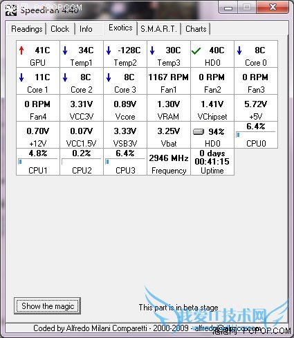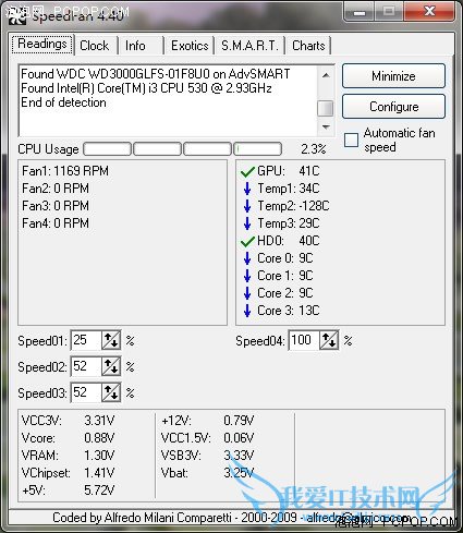 知名的硬件监控工具SpeedFan是高级DIY玩家必备的工具,它除了能够显示电压、风扇转速、CPU主频与温度、硬盘的温度与健康状况,包括电池电量、开机时间等这些重要系统信息之外,特色功能则是可以根据系统温度更改风扇转速。