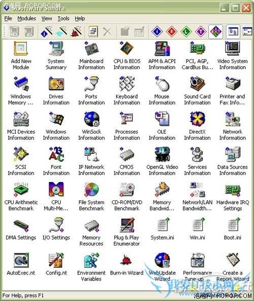 SiSoftware Sandra (the System ANalyser, Diagnostic and Reporting Assistant)一套功能强大的系统分析、诊断、测试和报告工具,包括众多的分析与测试模组。