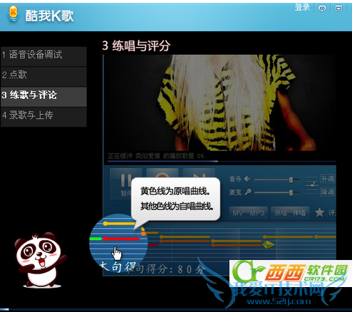 4、你可以先练唱唱几遍,黄色线为原唱曲线,其他色线为自唱曲线