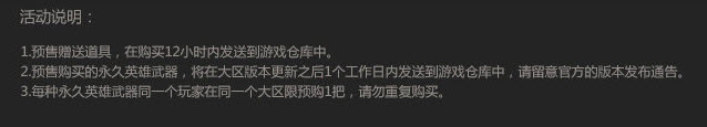 (1)道具预售:预售购买的永久英雄武器,将在大区版本更新之后1个工作日内发送到游戏仓库中,请耐心等待;预售赠送道具,在购买12小时内发送到游戏仓库中;