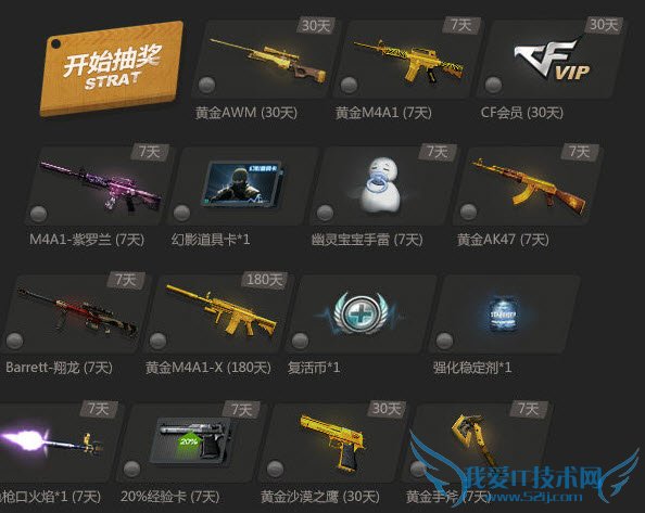 (3)抽奖:每位自然人用户在抽奖机会大于等于1时,每消耗1次抽奖机会可进行一次抽奖,抽奖奖品有:黄金M4A1-X(180天)、黄金沙鹰(30天)、黄金AWM(30天)、黄金AK47(7天)、黄金M4A1(7天)、黄金军用手斧(7天)、Barrett-翔龙(7天)、M4A1-紫罗兰(7天)、幽灵宝宝手雷(7天)、幻影道具卡*1、紫色枪口火焰(7天)*1、强化稳定剂*1、20%经验卡(7天)、复活币*1、CF会员(30天)和1次抽奖机会。黄金M4A1-X(180天)、黄金沙鹰(30天)、黄金AWM(30天)、黄金AK47(7天)、黄金M4A1(7天)、黄金军用手斧(7天)、Barrett-翔龙(7天)、M4A1-紫罗兰(7天)、幽灵宝宝手雷(7天)、幻影道具卡*1、紫色枪口火焰(7天)*1、强化稳定剂*1、20%经验卡(7天)、复活币*1、CF会员(30天)将以CDKey形式实时发放,用户可在2013年8月31日前,前往http://cf.qq.com/web201105/cdkey.shtml兑换,每类奖品兑换后,仅会发放一个该奖品,数量和使用时间均不累加,用户可在上一个已兑换奖品有效期到期后,继续进行兑换。