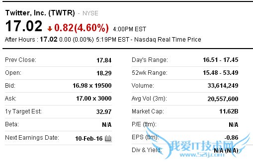 凤凰科技讯 北京时间1月26日消息,据美国Mercurynews网站报道,受公司多名高管离职消息影响,Twitter股价周一下挫,盘中股价一度跌至16.51美元、跌幅达7.5%,逼近历史低点。截至当天美股收盘,Twitter股价跌0.82美元,收于17.02美元,跌幅为4.6%。当前Twitter股价已远远远于其26美元的IPO发行价。