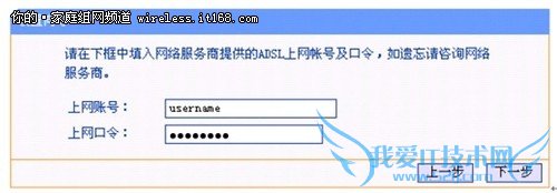如果您明确知道你家的上网方式是PPPoE,即ADSL虚拟拨号方式,那么就选择此项。ISP也就是你的宽带服务商会给你提供上网帐号和口令,则您需要在下图所示页面中输入ISP提供的ADSL上网账号和口令,如下图所示: