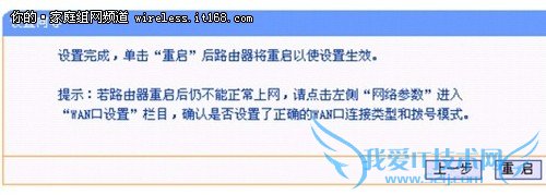 单击重启使无线设置生效。如果您没有更改无线设置,将弹出设置向导完成界面,单击完成结束设置向导。下面你就可以上网试一下了!有网的感觉就是爽!