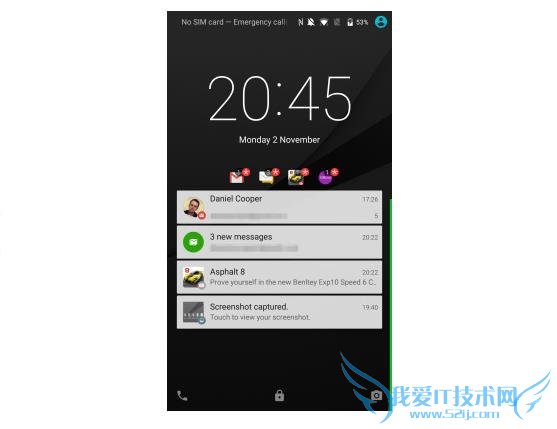 系统UI方面,黑莓只作了一些小改动,外观上更接近原生Android。有新通知时,会在App图标上显示五角星提示,系统图标也做了重新绘制。值得一提的是,黑莓在系统中加入了很多快捷操作方式:在Home键上向三个不同的方向滑动可启动三个不同程序;在侧面屏边缘滑动,可以调出快捷方式和常用联系人,这些都让人感觉非常人性化,这也是原生安卓需要借鉴的地方。
