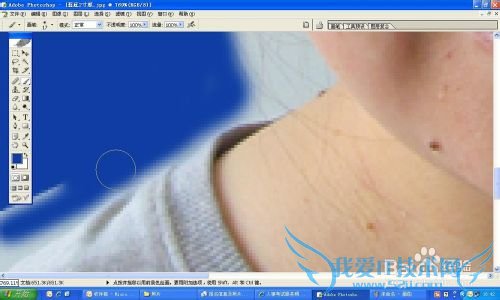 10、填涂完毕后反复检查至达到要求,然后用模糊工具勾画人物和背景的边缘线,以缩小至与屏幕匹配后达到要求为准,至此蓝底的二寸照片就制作完成。
