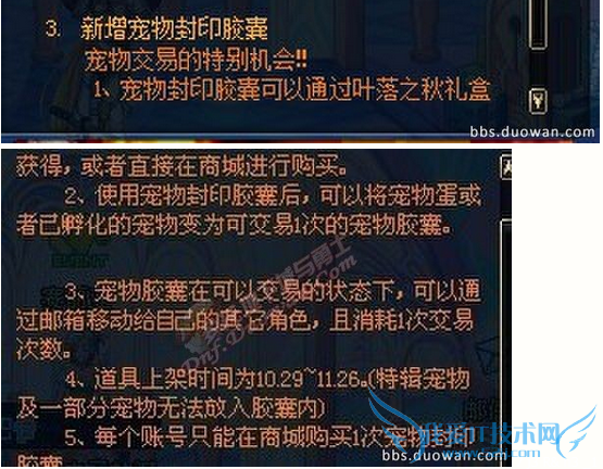 这次的宠物交易系统不是永久的,商城出售的这个宠物封印胶囊出售时间为:10.29~11.26日,所以呢,有多余宠物的玩家可以趁着这段时间把好点的宠物封印了,等活动过了再卖高价。