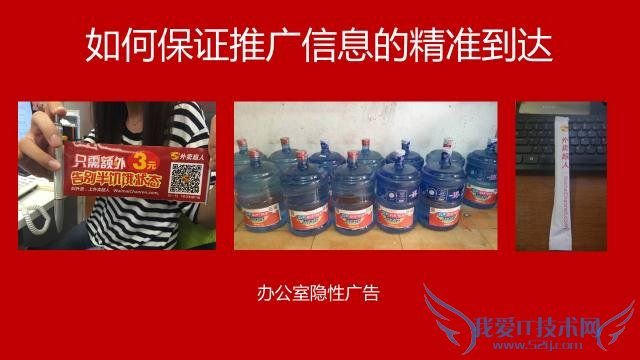 还有我们做了一些办公室的隐性广告,比如我们和一个水站达成合作,在他们的水的瓶子上贴我们的广告,这些水是根据他们的配送、物流进入办公室的内部,这样如果有员工上班路上看到我们的传单,进入办公室喝水的时候又看到我们的传单,他饿了想吃外卖的时候,我想使用我们的平台概率会高一些。