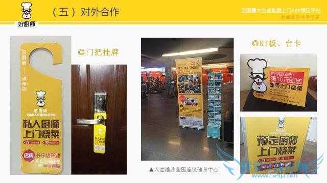 第四就是资源置换。地铁广告也是拿体验券换的。但体验券千万不能乱送,你在否认自己的价值。好厨师跟浩沙的合作,定制了运动营养餐,在浩沙北京核心的所有点全部挂了易拉宝,门把的挂牌。说实话大家做一些地推无非就那几种,没有什么门槛,但核心的竞争力在于人。都知道做地推发传单,发卡,扫街扫楼但这都是工具,你用这个工具去做成这个事情,人跟人做成的事情效果是本质上不同的,从工具上解决,当时一个挂把解决了很多的转化率。