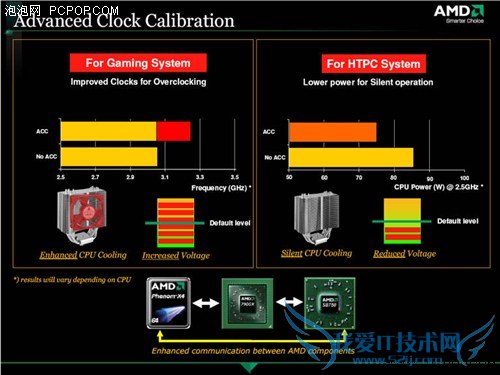 ACC全称为Advanced Clock Calibration——高级时钟校准功能,它其实就是内建在SB750南桥的一颗控制器。SB750有六组线路直接连上AMD Phenom处理器,能实时监控AMD Phenom处理器内部时钟并快速修正,配合OVER Driver软件能进一步提升AMD Phenom处理器的超频空间。从前ACC的设置范围为-2到0,而SB750推出以后,允许设置的范围增加到-12到12。ACC值越高,就更利于CPU超频,而较低的ACC值则可使CPU运行在低电压的节能状态。