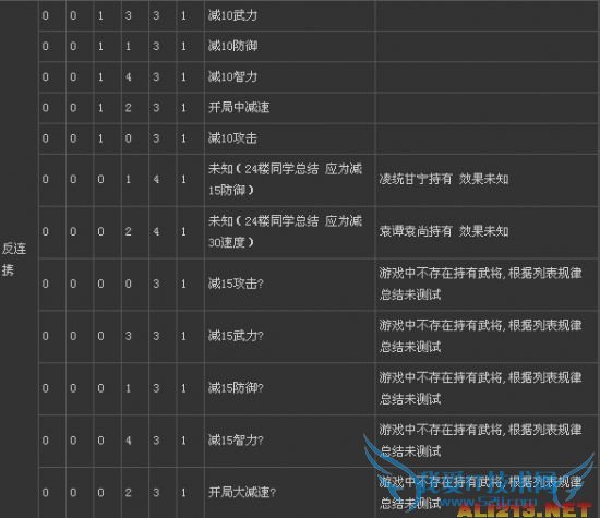 这样的话 固定连携表里凌统甘宁、袁谭袁尚的反连携效果就可以确定了 ,分别是减15防和减速30% ,只是没有测试确认。