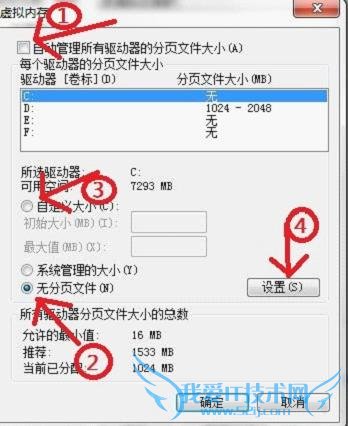 7.这是设置虚拟内存的,首选把箭头1处的取消才能进行接下来的操作,然后选中C盘,单击箭头2,将虚拟内存设置在别盘,如D盘,选中D盘,单 击箭头3,设置一个最小值,一个最大值,最后一定要先单击箭头4,才能点确定!!