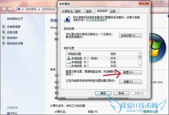 3.计算机右键—属性—系统保护(左边 一排第3个),出来如下,单击箭头处然后选择删除即可。