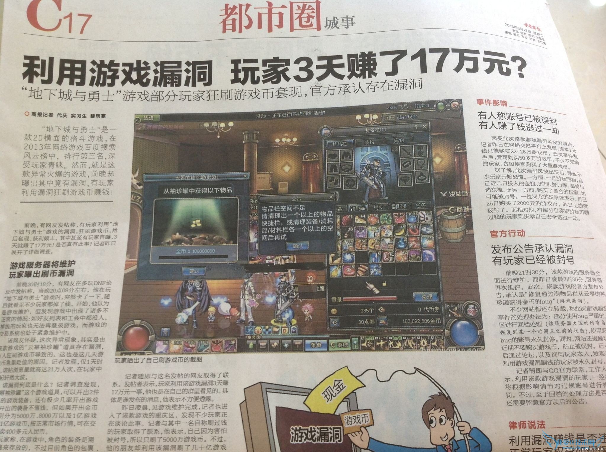 dnf云幂bug卡金币上报纸 玩家利用漏洞3天狂赚17万RMB