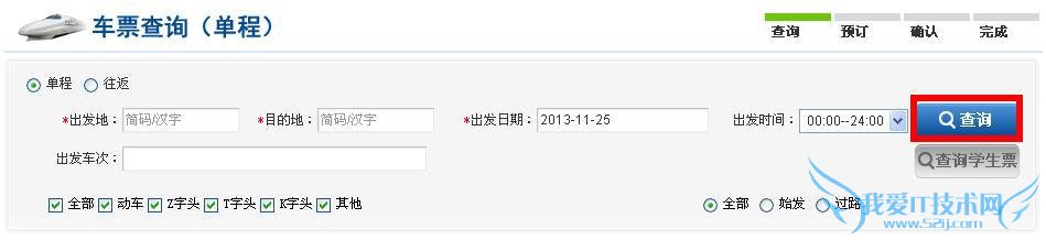 7、进入车票查询界面,按需选择“单程”或是“往返”、“出发地”、“目的地”、“出发日期”、“出发时间”,最后点击“查询”按钮