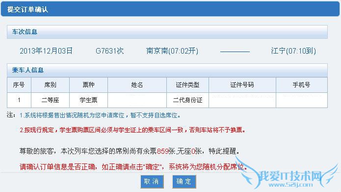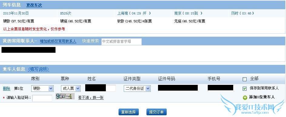 9、点击“预订”按钮后填写乘车人信息,然后提交订单
