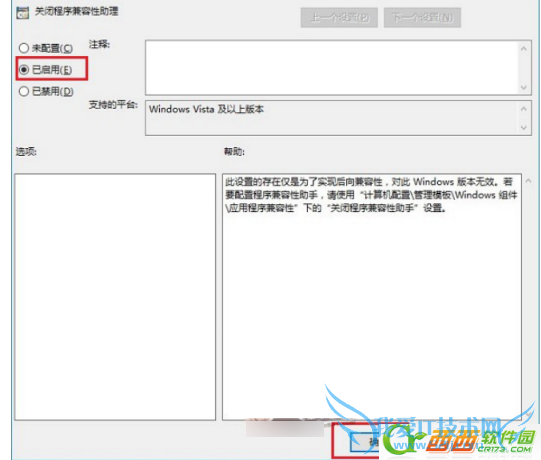 3、最后在弹出的属性窗口中选择“已启动”,然后点击底部“确定”按钮保存操作,这样即可关闭这个讨厌的“程序兼容性助手”功能了。