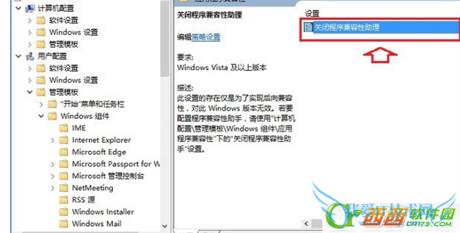 2、接下来在组策略编辑器窗口左侧列表中依次点击选择“用户配置→管理模板→Windows组件→应用程序兼容性”。然后在窗口右侧的列表中双击其中的“关闭程序兼容性助理”选项